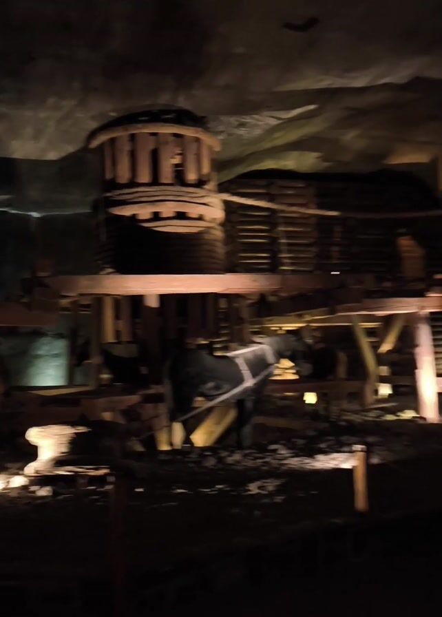 n interior view of the Wieliczka Salt Mine in Poland. The scene is dimly lit, and a large, wooden winding machine is visible in the center, with a horse-like figure harnessed to it. Several people are walking through the mine chamber, observing the exhibits and using their phone cameras. The cavernous space is rough and uneven, with the walls carved from salt deposits. Overall, the video captures the atmosphere of an underground historical site showcasing mining technology and attracting tourists.