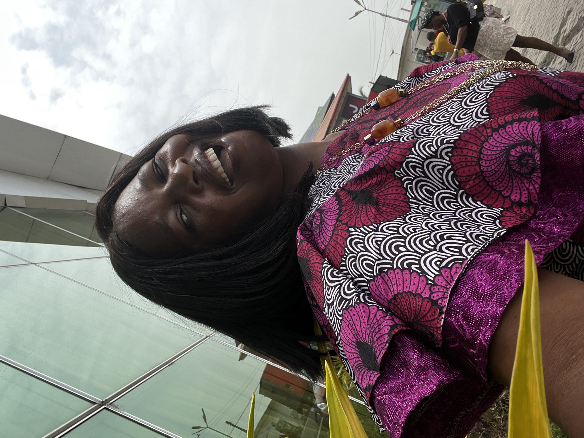 A medium shot captures a dark-skinned woman smiling at the camera. She wears a vibrant, patterned dress in shades of pink, black, and white, adorned with a gold chain necklace featuring amber-colored beads. The woman has short black hair. A modern glass building, possibly an office or commercial space, is visible in the background. Ado, Nigeria is the location based on the person's description. A pedestrian walks in the background.