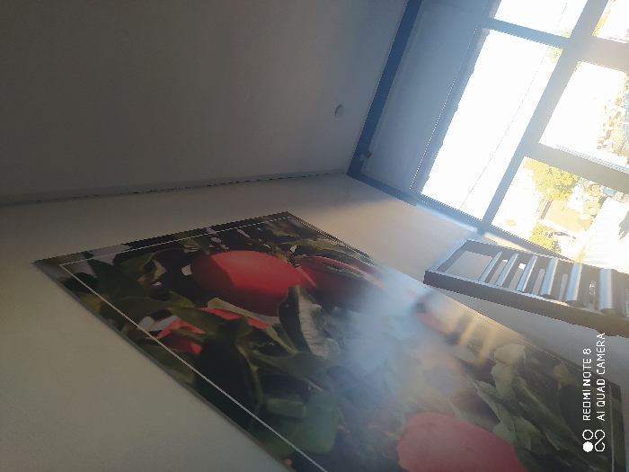 The image displays an interior room, presumed to be in Majjate, Morocco, captured from a low, upward-angled perspective. A large, rectangular wall print, oriented diagonally on the left wall, depicts vibrant red fruits, possibly pomegranates or apples, among green leaves. Below this print, a watermark indicates "REDMI NOTE 8 AI QUAD CAMERA." To the right of the print, a tall, narrow, vertical metal shelving unit with multiple horizontal tiers is partially visible against the wall. The right side of the scene features a large, multi-pane window or glass door system, through which intense natural light enters, causing glare and overexposure that obscures specific exterior details. Vaguely discernible through the window are outdoor trees with green foliage, a paved surface, and distant, indistinct structures. The interior walls and ceiling are white or light-colored, with a recessed circular light fixture visible in the ceiling's corner. No individuals are present or identifiable in the frame.
