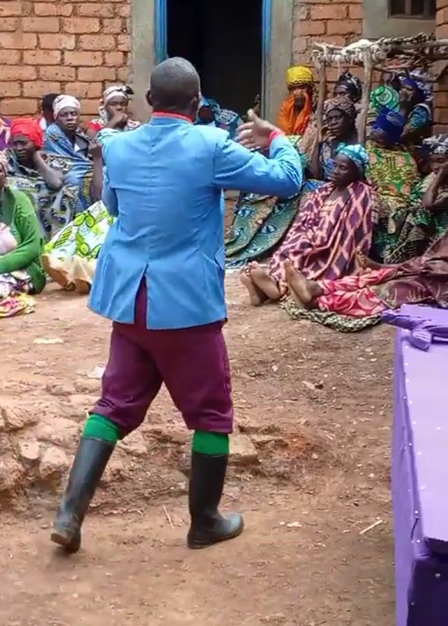 A man in a blue jacket, red shirt, purple pants, and black boots stands in front of a group of women sitting on the ground. The man appears to be addressing or teaching the women, as he is gesturing with his hands and holding a small book or notepad. The women are seated on a variety of colorful blankets and fabrics. They are all wearing various head coverings. The setting appears to be outdoors, in front of a brick building with a blue door. The ground is dirt and there are small bits of vegetation. The lighting suggests it is daytime.