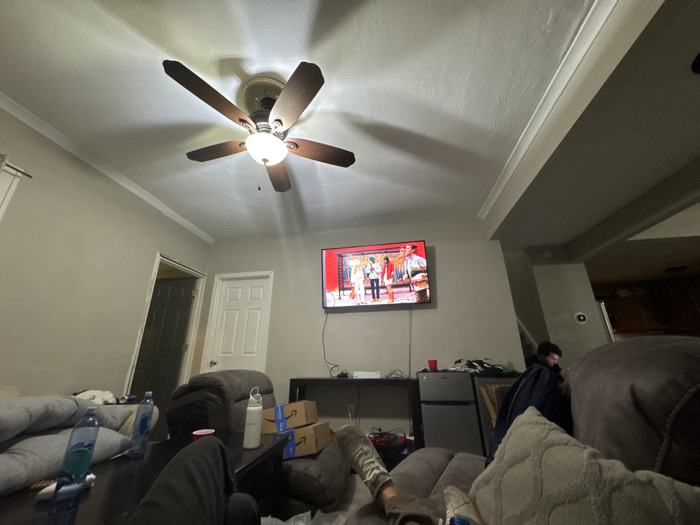 This image depicts an interior living room, identified as being in South Bend, United States. The room features light-colored walls with white crown molding and a white ceiling from which a five-blade brown ceiling fan with a central light fixture is suspended and illuminated, casting shadows. A flat-screen television is mounted on the far wall, displaying a scene with multiple individuals in colorful clothing. Below the television, a dark console table supports an unidentified electronic device and is situated next to a silver/black compact refrigerator. Two brown cardboard boxes are present on the floor beside the console table. In the foreground, a dark-colored coffee table or ottoman holds three plastic water bottles (at least two with blue labels), one white insulated tumbler, and a red plastic cup. Two sets of human legs are visible in the immediate foreground: one set to the left, wearing black pants and white socks, with feet resting on the table; and another set to the right, wearing light-colored pants and shoes with dark soles, with one foot propped. Several upholstered sofas or recliners, in dark grey or brown, are visible. A person is seated on a sofa in the midground to the right, largely obscured by furniture and draped with a dark blanket or jacket, with their head partially visible. Another sofa to the left is covered with blankets or cushions. In the background, two doors are present: a partially open dark door to the left, and a closed white door to the right.