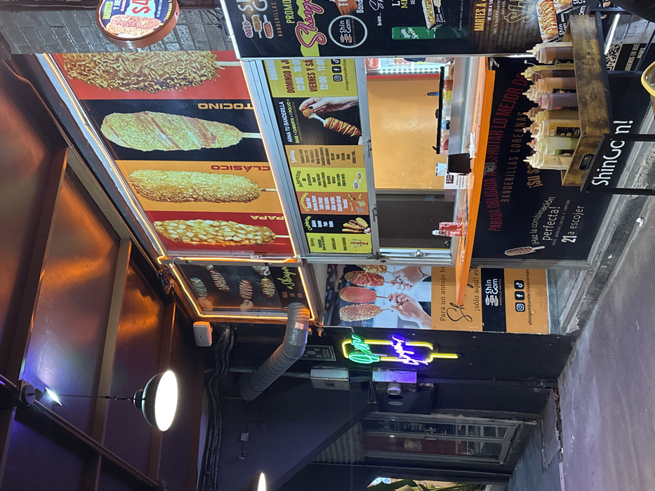 A street food vendor named Shingon sells Korean corn dogs, or "banderillas coreanas." Banners display images and names of different corn dog options: "tocino," "clásico," and "papa." They also promote customizable options, including a selection of sauces and toppings. Hours of operation are listed, and the vendor's social media handle is displayed for online engagement. The neon sign and multiple food posters add visual interest to the overall scene.