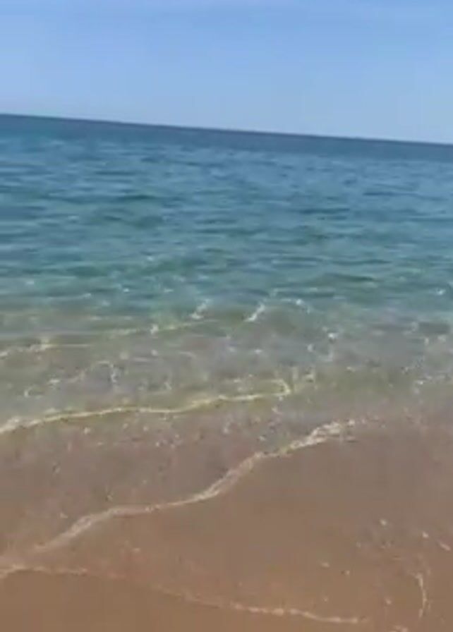 The camera pans across a beach with a blue ocean