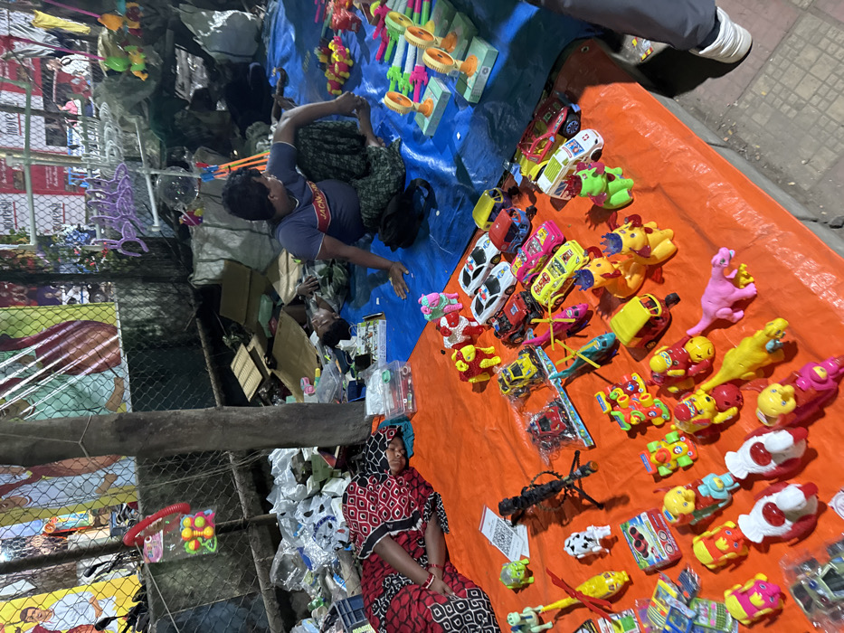 This image captures a nighttime street vendor stall in Bidhannagar, India. The scene shows three individuals present at the stall. On the left, a woman wearing a red and black patterned garment is lying down on an orange tarpaulin, seemingly resting or asleep, with her head on a teal cloth. Adjacent to her, a man sits cross-legged on a blue tarpaulin, wearing a blue t-shirt with "JACKRO" text and a patterned lungi, looking towards the right. Behind him, another individual is lying down on the blue tarpaulin, also appearing to rest. The lower leg and white shoe of a fourth person are partially visible on the far right edge of the frame. The foreground is dominated by an extensive display of colorful plastic toys spread across the orange tarpaulin. These include various miniature vehicles such as cars, trucks, and helicopters, alongside animal figures like cows, dinosaurs, and ducks. Several toys, including some cars, are individually wrapped in clear plastic. A small black tripod-like object is also present on the orange tarp. On the blue tarpaulin, multiple small, colorful toy fans are neatly arranged. The background features a wire mesh fence adorned with large banners displaying images of people and text, suggesting political or promotional advertising. A substantial wooden pole or tree trunk stands vertically in the center of the image. Piles of discarded materials, including cardboard boxes, plastic bags, and other debris, are scattered behind the individuals, indicating a makeshift or informal market setting. The area is illuminated by artificial light sources, casting shadows and highlighting the merchandise.