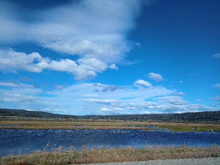 A vibrant blue sky, dotted with fluffy white clouds, overlooks a serene landscape. Below, a body of water reflects the sky's hues, mirroring the cloud formations above. A band of grassland stretches along the water's edge, transitioning into a dense, dark green forest that marks the horizon. The foreground features dry, grassy vegetation, adding depth to the scene. The overall impression is one of natural beauty and tranquility.