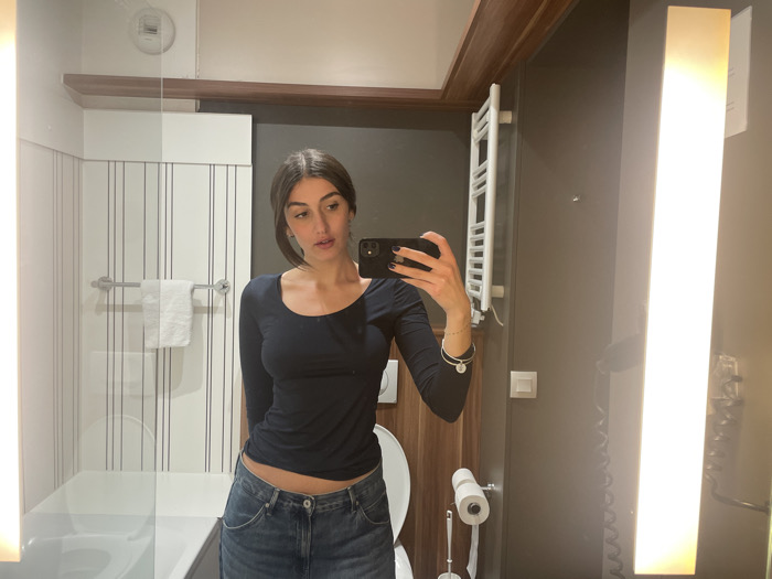 A young woman stands in a bathroom, taking a selfie in the mirror. She wears a long-sleeved navy shirt and blue jeans. The bathroom features a white bathtub with striped paneling, a towel rack with a white towel, and a heated towel rack on the wall next to a light fixture. A toilet and toilet paper holder are visible. The overall scene suggests a modern, clean hotel bathroom.