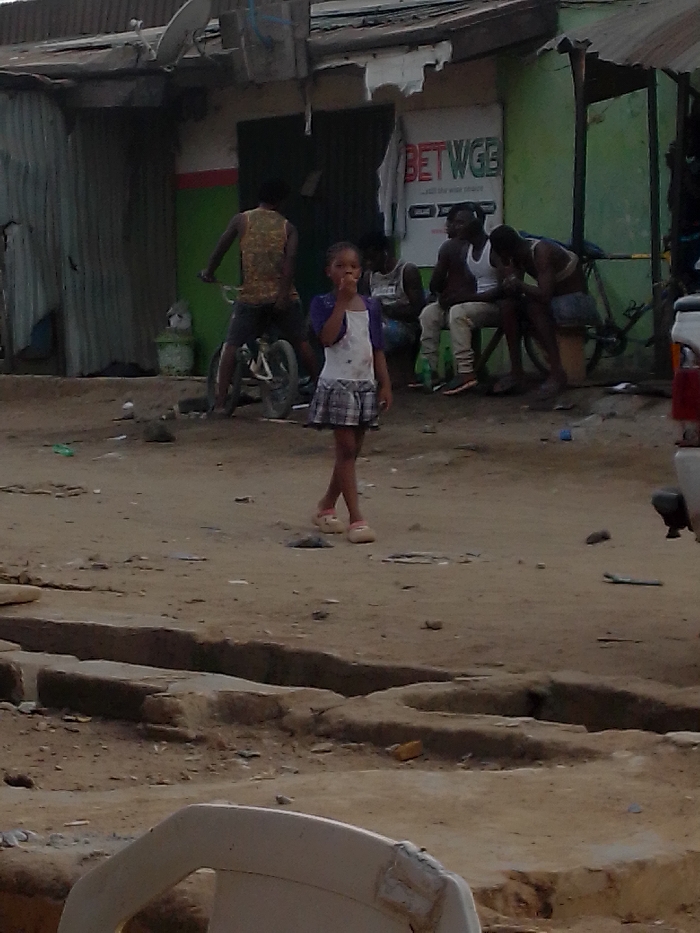 In a dusty, seemingly impoverished outdoor setting, a young girl in a dress stands prominently, eating something she holds in her hand. Behind her, three men are seated outside a building with a "BETWGE" sign. Another man rides a bicycle nearby. The location appears to be an underdeveloped area with simple structures, perhaps a local street scene with everyday activities.