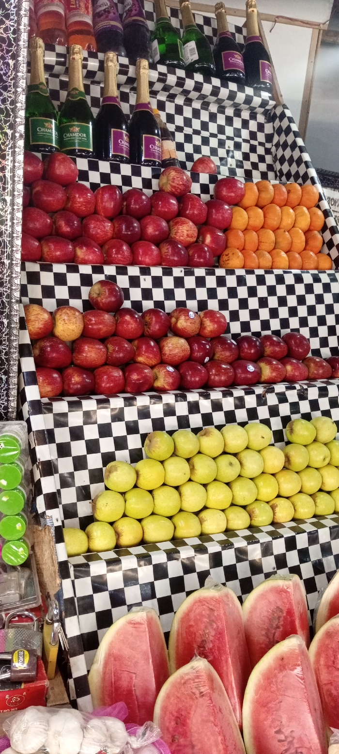 - "The image displays a tiered retail stall in Aviation Quaters, Nigeria, presenting a variety of fruits and bottled beverages" by FM-oATT32, licensed under CC BY 4.0