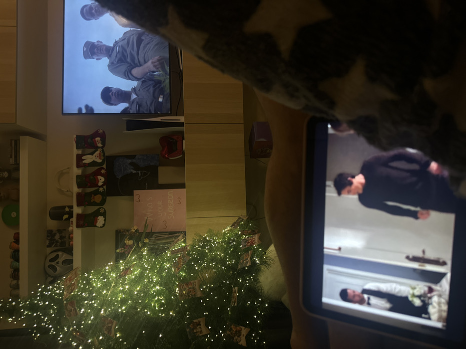 A scene is captured with a Christmas tree adorned with lights dominating the foreground. Above the tree, a TV displays what appears to be a historical war movie. Beside it are Christmas stockings and a pink sign saying "Who's your surgeon". In the lower right corner, a tablet screen shows a clip from the TV show "Nip/Tuck," featuring characters in a bathtub. A star-patterned fabric is draped in the upper portion of the image, partially obscuring the view.