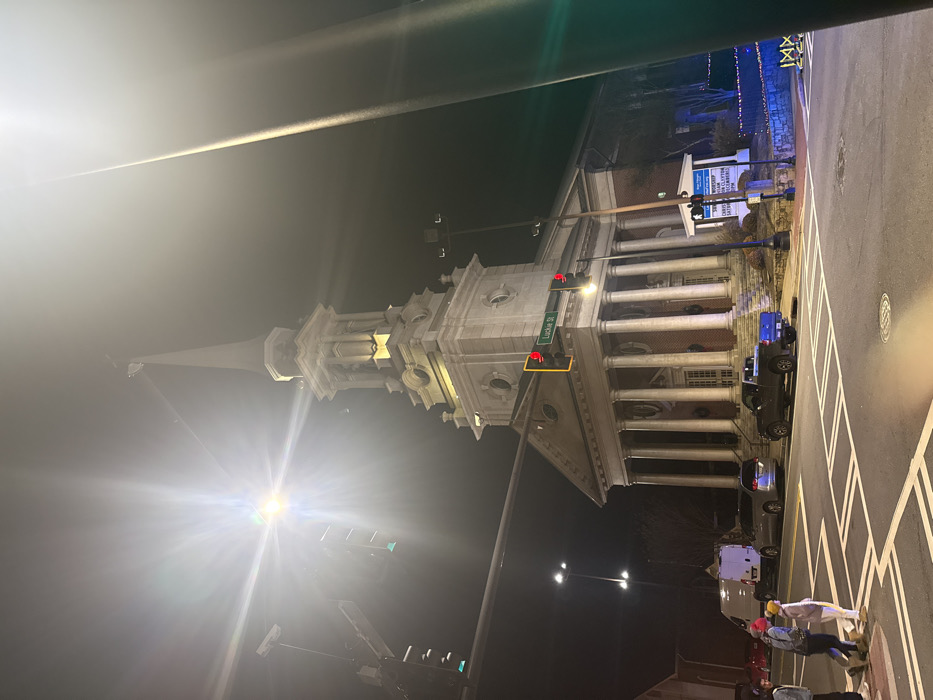 At night, an angled view captures a brightly lit church