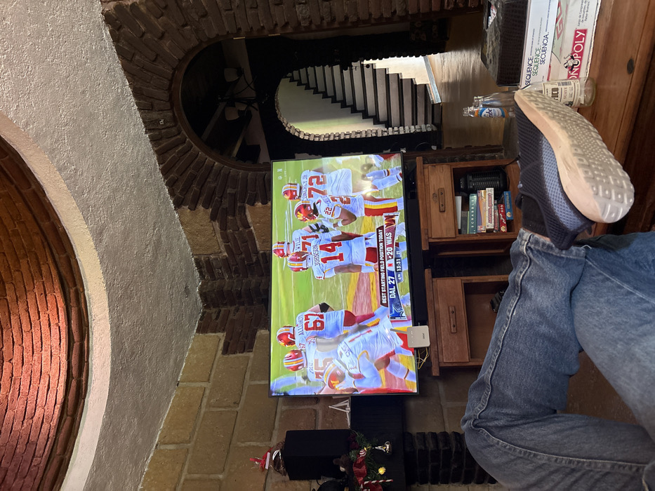 A person sits in front of a television showing a football game. The Dallas Cowboys are playing the Washington Commanders; the score is 27-20 in favor of the Cowboys. The individual's legs are crossed, with one foot resting on a wooden surface. A shelf filled with books and games is visible behind the legs. The room features unique architecture, including arched brick doorways and a staircase. A Monopoly game is also present.