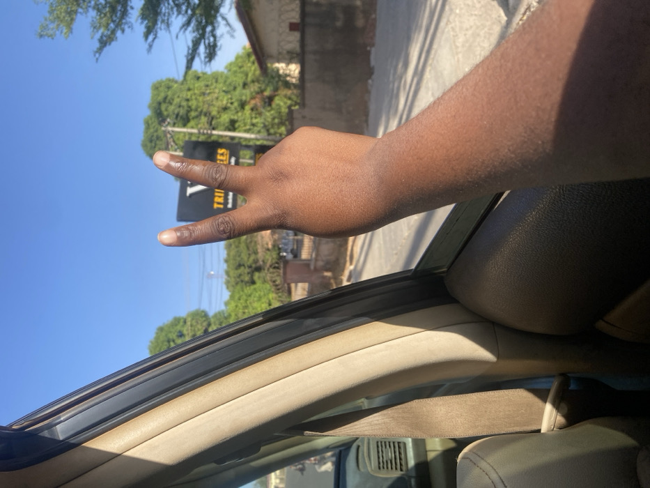 The image depicts an exterior street scene in Barnawa, Nigeria, viewed from the interior of a vehicle. A person's dark-skinned right arm extends outward through the open vehicle window on the right, forming a peace sign with the index and middle fingers extended. Inside the vehicle, a beige seatbelt and matching interior pillar are visible on the left. Outside, under a clear blue sky, a black vertical signboard featuring the white letters "V" and "TRIBEES" is prominent. Below "TRIBEES," smaller text reads "School of Business & Hospitality." Green trees and foliage are visible behind and around the sign, with a light-colored building or wall segment to the far right. A paved road stretches across the midground. Faint outlines of another vehicle and individuals are discernible on the left side of the street. Strong natural sunlight illuminates the scene, casting shadows.