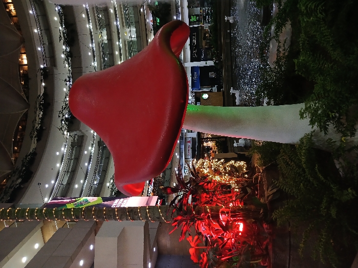 A large, red, mushroom sculpture dominates the scene, with a white stem transitioning into green near the top. The setting is a multi-level indoor space, seemingly a shopping mall, with visible storefronts like Starbucks and other illuminated shops. Water feature or fountain can be seen above the mushroom sculpture, alongside dense green plants. The scene is embellished with strings of small, warm lights wrapping around a horizontal structure.