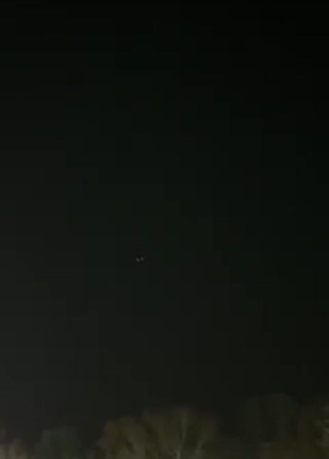dark night sky with the faint glow of lights in the distance. A line of trees is visible along the horizon. A child's voice can be heard in the background. The focus is on the dark sky and distant lights.