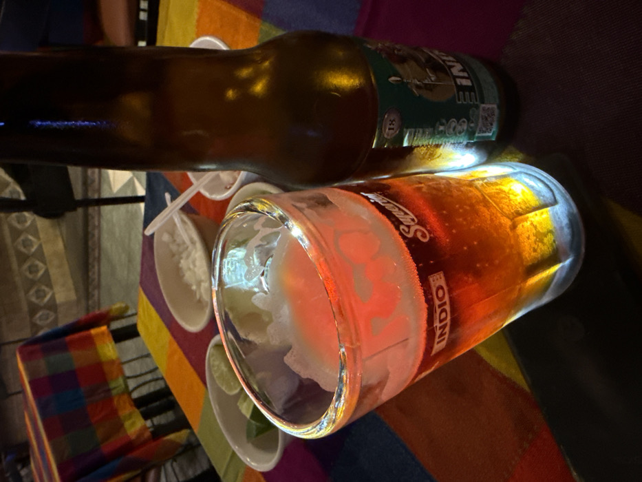 The image depicts a close-up, eye-level view of a table setting in a dimly lit establishment, likely a restaurant or bar, in Puebla City, Mexico. A clear glass, approximately half-full with an amber-colored beer and a head of foam, is centered in the foreground. The glass displays "INDIO" branding. Adjacent to it on the right is a brown glass bottle of Indio beer, mostly full, featuring a green label with the brand name, an indigenous figure, and the number "18." Both the glass and bottle rest on a vibrant, multicolored striped tablecloth exhibiting shades of red, orange, yellow, green, blue, and purple. To the left and slightly behind the beer glass, two small white ceramic bowls are present. One contains diced white onions with a plastic spoon, and the other holds several lime wedges. A third, smaller white bowl is partially visible. The background reveals an out-of-focus table draped with a similar colorful tablecloth and a wall featuring a repeating pattern of light-colored geometric shapes against a darker surface. No individuals are visible.