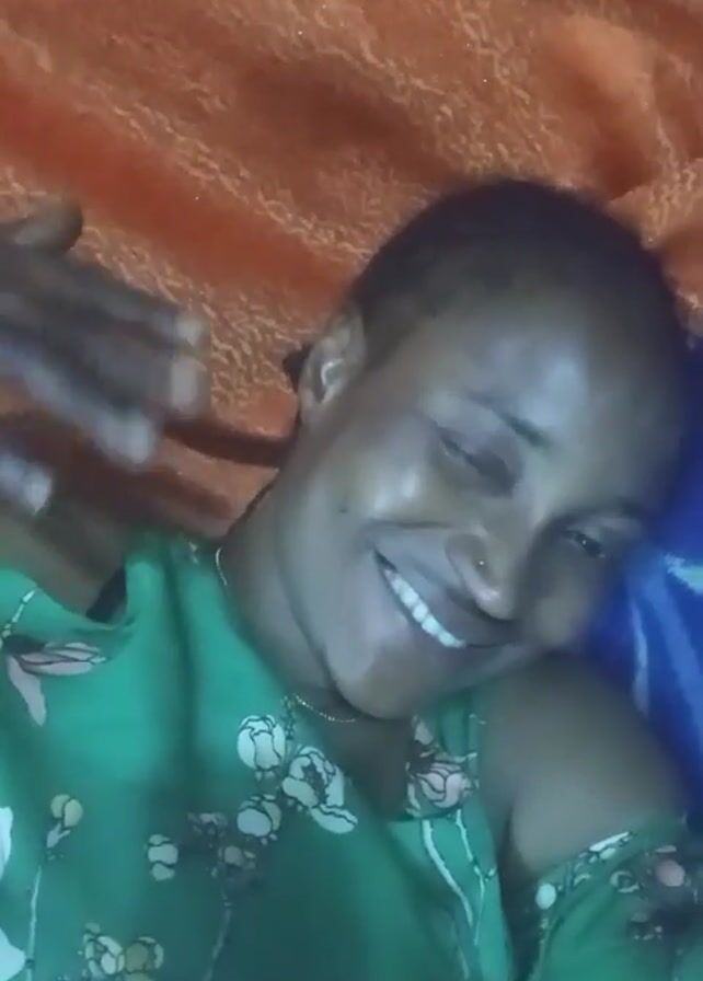 A dark-skinned woman, wearing a green floral print top and a gold chain, smiles at the camera. She is reclining against an orange textured background with a glimpse of blue fabric to the side. Her hair is pulled back, and she has a nose piercing. Her left hand is slightly raised and blurred in the foreground.