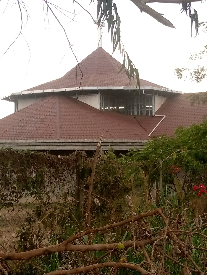 A two-tiered building with a red tiled roof is the main subject, appearing behind dense vegetation. The building is octagonal, with the top tier smaller and topped by a cross. A row of windows encircles the upper tier. The lower tier is partially obscured by foliage. The greenery in the foreground includes overgrown vines, branches, and some red flowers. A grey sky forms the backdrop.