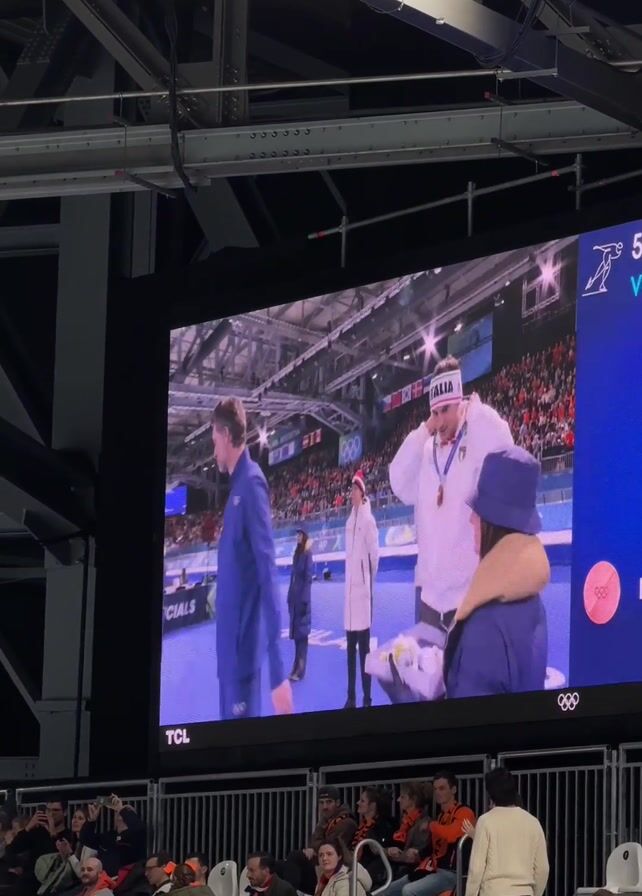 The video captures a scene at an indoor arena, likely for a sporting event. A large screen displays an image of two men and a woman. One of the men is wearing a white jacket and a headband with "ITALIA" on it. He has a medal around his neck and is touching it. A second man is wearing a blue jacket and standing to his left. The woman stands between the men. A portion of the screen displays "50," "VICT," "ITALIA," and the Olympic rings. The camera then pans across the arena showing spectators in the stands, many wearing orange clothing. The camera then focuses on a blue ice rink where athletes and officials are gathered. The stands appear to be filled with people.
