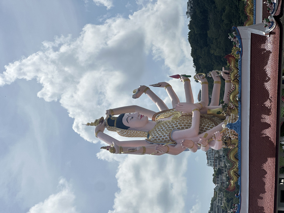 A sideways view shows a statue of a deity with multiple arms against a backdrop of cloudy sky and a hillside with buildings