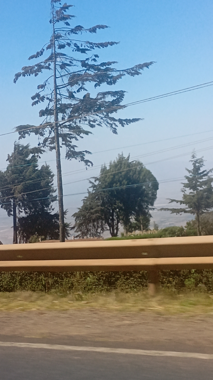 A roadside view captures trees against a hazy blue sky. A tall, sparse tree dominates the scene, its branches reaching outwards. Several smaller, greener trees line the horizon. A brown guardrail and roadside vegetation are in the foreground, with a paved road visible. Power lines cut across the sky, adding a sense of human presence to the natural landscape. The overall composition suggests a moment captured during travel.