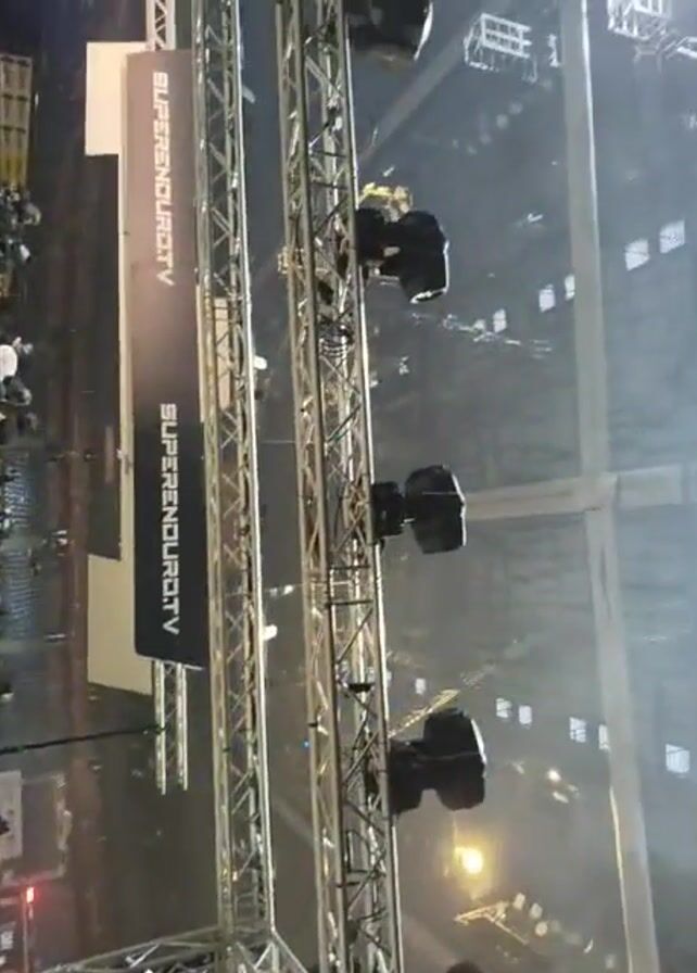 The video depicts an indoor motocross event venue. A row of motorcycles with riders in full gear is visible, lined up on a dirt track. Above, a metal truss structure supports multiple spotlights and signage that reads "SuperEnduroTV". The arena is dimly lit, with vibrant blue and purple lighting effects creating an atmosphere of excitement. People, likely team members or spectators, can be seen standing in the background. The camera's perspective is from within the truss structure, looking down at the scene.
