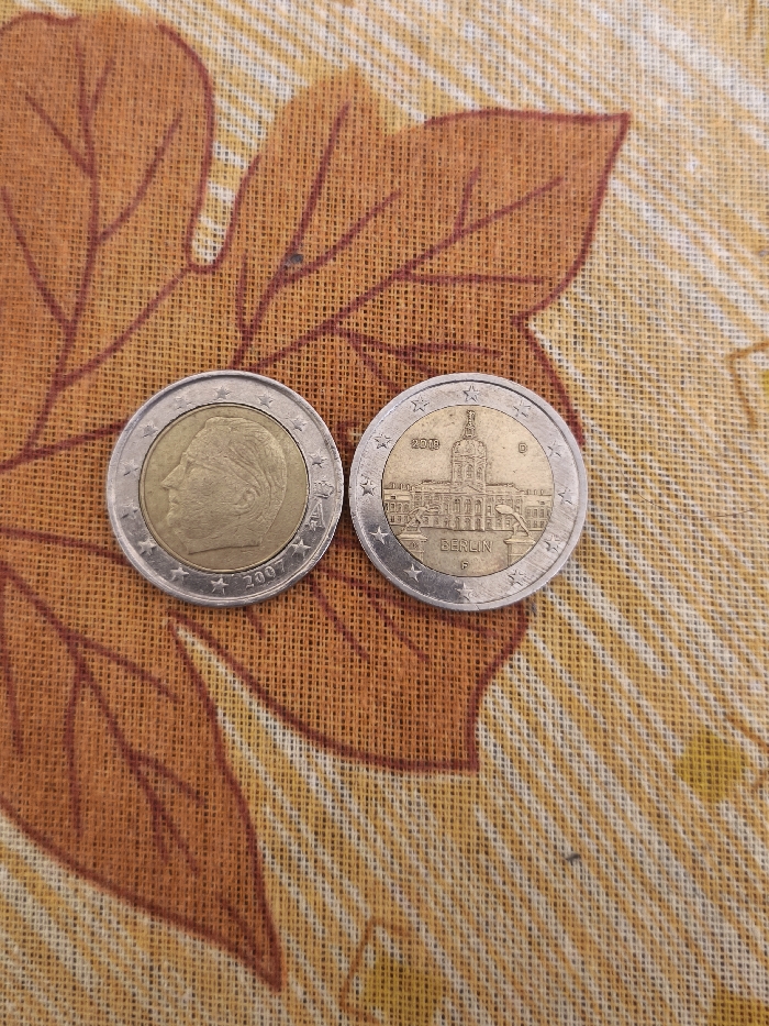 Two bimetallic 2 Euro coins are displayed against a patterned textile surface. No individuals are present, and no actions are occurring within the frame. The coin on the left, dated "2007", features a left-facing profile of a person (consistent with King Albert II of Belgium) on its golden core, surrounded by a silver ring adorned with twelve stars. The coin on the right, dated "2018", shows the Charlottenburg Palace with the inscription "BERLIN" and the mint mark "F" on its golden core, also encircled by a silver ring with twelve stars. The coins rest on a woven fabric with a repetitive autumnal leaf pattern. The fabric exhibits a visible thread texture, with stylized leaves in shades of brown and orange set against a lighter yellow-beige background. The specific location within the city of Kalipetrovo, Bulgaria, cannot be determined from the visual evidence provided in the image.