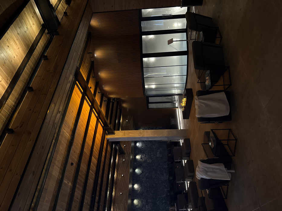 This image depicts an indoor relaxation or lounge area located in Bania, Bulgaria. The space features a high ceiling constructed from wooden planks and dark metal beams, illuminated by integrated warm orange and cooler white lighting. A prominent concrete-colored pillar supports the ceiling structure towards the left. The left wall is faced with dark, textured stone or rock, accented by recessed spotlights. The right wall is clad in vertical wooden slats, which curve around a large, multi-paneled glass enclosure. This enclosure appears to contain a water body, possibly a pool or spa, with the glass panels exhibiting a frosted or wet appearance that obscures clear visibility inside. In the center of the room, a low, rectangular fire pit displays active flames. Dark-colored lounge chairs and small, dark metal-framed tables are arranged across the light brown tile floor. Two white towels are draped over separate lounge chairs in the foreground. Additional lounge seating is visible along the left stone wall. No individuals are present or visible within the scene. A small, dark stand with a sign is positioned near the curved glass enclosure.