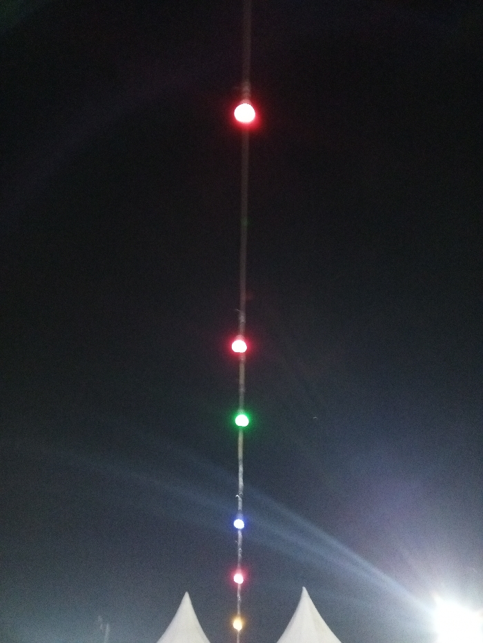 A vertical string of lights descends from a dark night sky. The lights alternate in color: red, green, blue, pink, and orange, with red appearing twice. The string seems to be hanging in front of two white peaked structures, possibly tents, illuminated by a bright light source. The background is a deep black, suggesting a nighttime or low-light environment. The composition is vertical and centered on the string of lights.