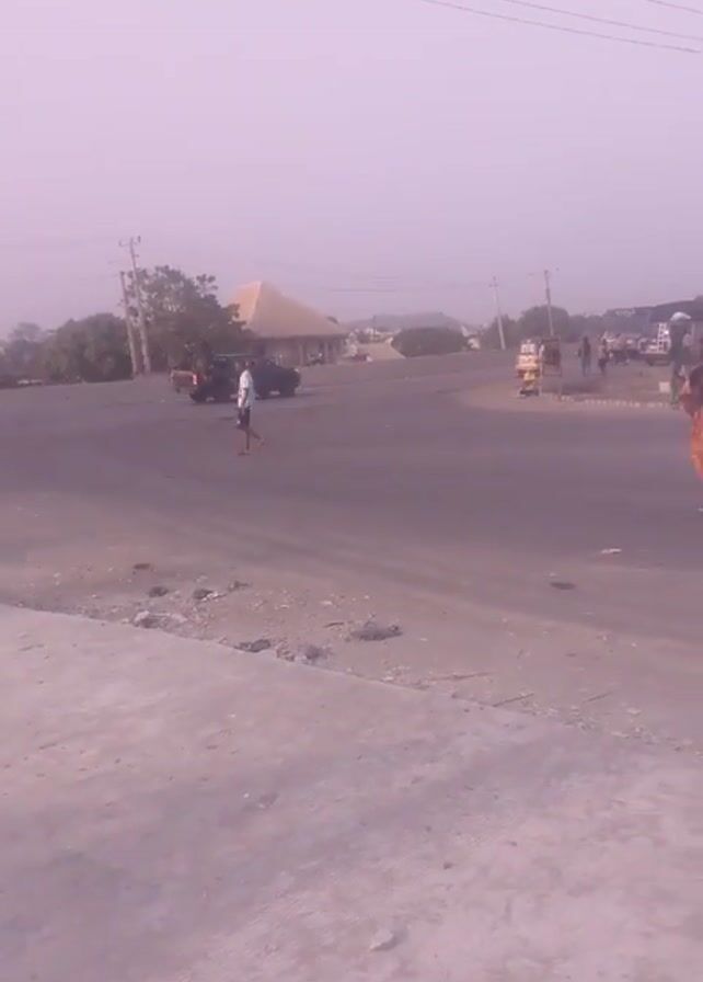 street scene in a seemingly urban or semi-urban area. Several people are walking on the road and near the sidewalks. A dark-colored pickup truck with multiple people in the back drives through the intersection. There are shops or stalls visible on one side of the road. Motorcycles are also present. The sky is overcast, creating a hazy atmosphere. Power lines and poles are visible above the road. The general environment appears dusty or slightly polluted.