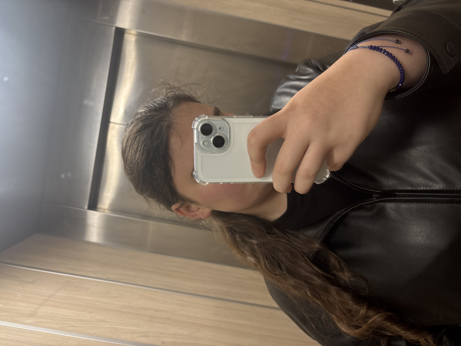 An individual is captured in a mirror selfie inside an elevator located in Strasbourg, France. The elevator interior features light-colored wooden paneling on the left wall and brushed metallic surfaces, including the doors, on the right and in the background. The person, whose face is largely obscured by a smartphone, possesses long, wavy, dark brown hair and is wearing a black zippered jacket over a black high-necked top. A white smartphone, encased in a clear protective cover, is held in the right hand, positioning its camera lenses prominently in the reflection. A multi-strand blue beaded bracelet with dark cord ties is visible on the individual's left wrist.