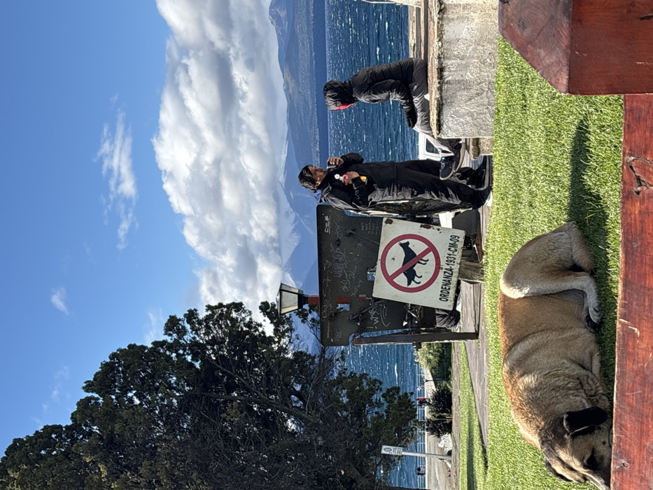 A "no dogs" sign stands near the water, next to a couple looking at the lake. A dog is lying down on the grass next to the fence. The sky is blue with white clouds and trees are in the front.