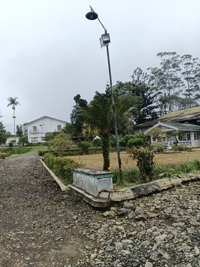The image displays an outdoor scene in Bien Hoa, Vietnam, under a uniformly overcast sky. A wide, unpaved path composed of gravel and dirt extends from the left foreground into the mid-distance. In the right foreground, a weathered rectangular concrete planter, with a light green base and grey top, abuts a broken concrete curb painted with black and white stripes. A tall, dark utility pole stands centrally, featuring a curved arm with a downward-facing light fixture and a rectangular floodlight attached below. To the pole's left, a small palm tree is visible. The midground primarily consists of a lawn with yellowish-green, dry grass, interspersed with various bushes and smaller trees. Two buildings are discernible in the mid-background: a multi-story white building with brown window shutters is positioned to the left, further down the gravel path. To the right, another building with a distinctive green roof, ornate white trim along the eaves, and white walls with multiple windows is partially visible. The background is characterized by dense tree foliage, including several tall, slender trees, extending upwards towards the grey sky. No individuals or vehicles are present.