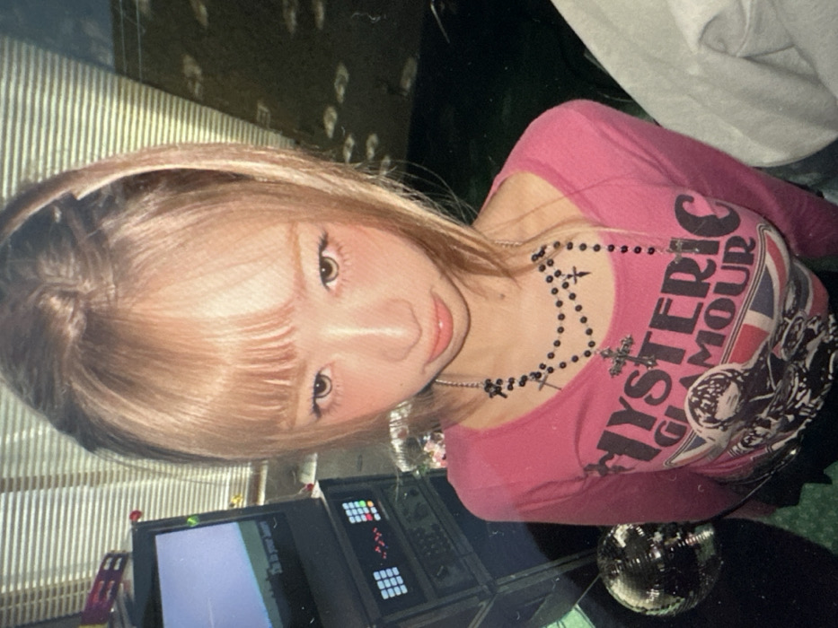 A young female individual with light blonde hair and bangs, styled with hair pulled back, is depicted in a close-up, slightly high-angle portrait. Her face displays prominent blush on the cheeks and full lips with a subtle pout, while her light-colored eyes gaze directly at the camera. She wears a long-sleeved, scoop-neck pink top featuring a graphic design that reads "HYSTERIC GLAMOUR" and includes a stylized image, possibly a figure on a motorcycle, superimposed over a Union Jack flag motif. A long, multi-strand black beaded necklace with several silver cross pendants is draped around her neck. To the left of the subject, a dark monitor or television screen displays a muted landscape image with the text "I'm in your heart". Below the screen, a dark console with multiple rows of illuminated buttons, including green, blue, and red lights, suggests an electronic entertainment system, possibly for karaoke or gaming. A silver disco ball is partially visible on the floor in the lower-left corner. Horizontal window blinds are visible in the blurred background to the subject's right. The scene appears to be an indoor setting, consistent with an entertainment venue or private room, such as a karaoke box or gaming room, common in urban areas. The specific location within Seoul, South Korea, cannot be determined from the visual information provided.