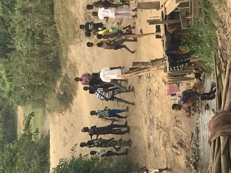 A group of people is walking on a dirt road between trees. The group consists of men and women dressed in various clothes. Some are wearing light-colored clothing, while others are wearing darker colors. Some have their backs turned, and some are facing the camera. There is a wooden structure nearby and some piles of wood.