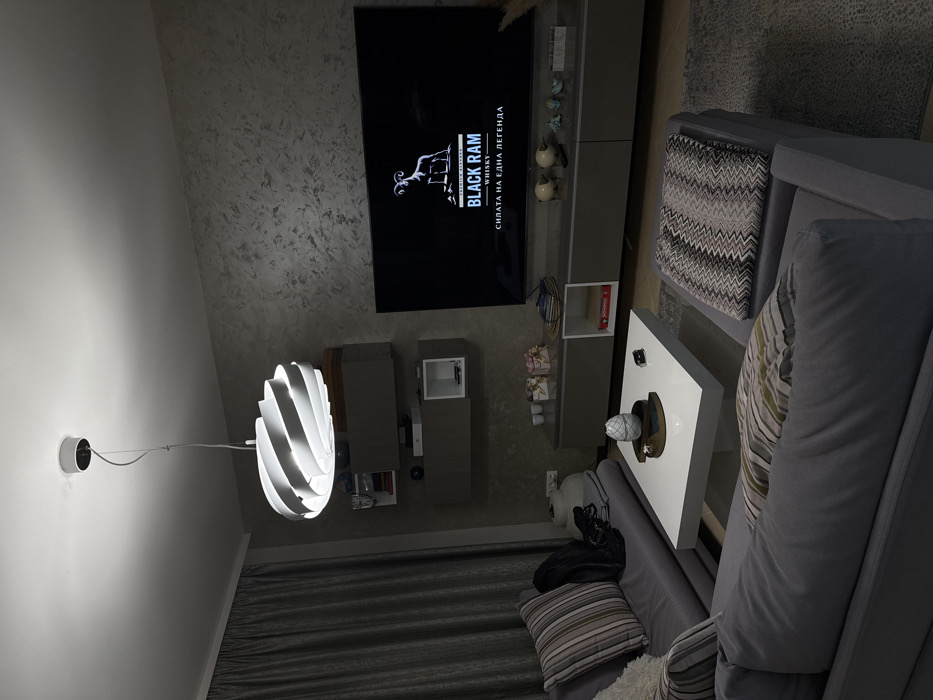This forensic description details an interior living space located in the city of Lozenets, Bulgaria. The scene displays a modern, furnished room with a subdued grey and white color palette. **Environment:** The room features a white ceiling with a centrally mounted, spiral-patterned white pendant light fixture emitting bright illumination. The back wall is finished with a grey, textured, possibly stucco-like surface. The left wall is mostly obscured by heavy, grey curtains. The floor is covered by a light grey, subtly patterned rug. **Objects and Furniture:** An L-shaped sectional sofa, upholstered in dark grey fabric, occupies the left and foreground areas. Several striped cushions in muted tones are placed on the sofa, along with a black garment draped over the backrest. A glossy white rectangular coffee table is positioned in front of the sofa. On the coffee table, a decorative white textured egg-shaped object rests in a dark brown tray, accompanied by a small black object. Along the back wall, a long, low grey media console is situated beneath a large, wall-mounted flat-screen television. The television screen displays a black background with a white "BLACK RAM WHISKY" logo, featuring a ram standing on a hill, and the Bulgarian text "СИЛАТА НА ЕДНА ЛЕГЕНДА" (The Power of a Legend). Above the media console, several grey modular wall-mounted cabinets are installed, some featuring open white compartments. **Items on Console/Shelves:** The media console holds various items: a stack of wrapped gifts with pink bows, a small stack of books or magazines, two decorative ceramic sheep figures, a remote control, and a collection of small blue and green decorative objects. An open compartment within the console contains a red board game box, likely "Monopoly." The wall-mounted shelves contain minimal items, including a few books or folders and small decorative pieces. **Absences:** No individuals are present within the frame. No discernible actions or interactions are depicted.