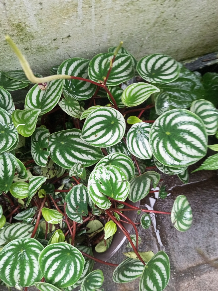 A vibrant watermelon peperomia plant fills the frame, its round, succulent leaves displaying distinctive concentric patterns of deep green and silvery-white. Thin, reddish stems support the dense foliage. An elongated, pale green flower spike emerges from the plant. The plant appears to be potted and placed near a concrete wall, with some leaves showing signs of water droplets.