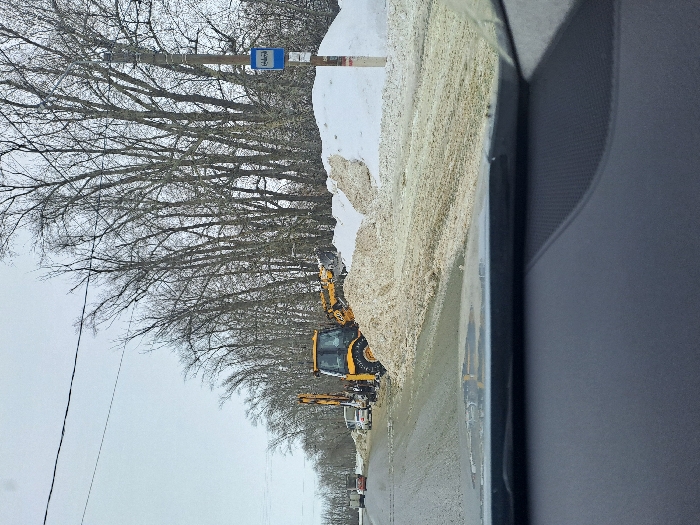 A roadside view shows a snow-cleared path, a yellow excavator clearing more snow, and a blue bus stop sign. Bare trees line the road, contrasting with the white snow mounds. The image appears to be taken from inside a car. The weather looks overcast.