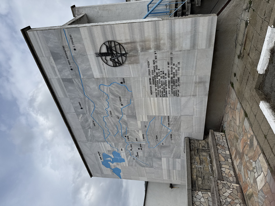 The image displays an exterior wall of a building located in Panicherevo, Bulgaria, under an overcast sky. The dominant feature is a large, rectangular wall constructed from numerous rectangular panels of light gray marble or stone, exhibiting subtle darker gray veining. This wall serves as a public informational display. On the left and central portions of the wall, a detailed geographical map is inscribed or painted. Blue lines delineate waterways or canals, while a large, irregularly shaped blue area represents a body of water, possibly a reservoir, featuring a small white symbol resembling a sailboat. Several Cyrillic place names are visible across the map, including "Сливен," "Ямбол," "Р. ТУНДЖА," "НОВА ЗАГОРА," and "С. ГОРНО АЛЕКСАНДРОВО," indicating settlements and geographical features within a regional context. To the upper right of the map, a circular, dark metal emblem is affixed to the wall. This emblem features a stylized design resembling wheat stalks or agricultural crops within its circular frame. Directly below this emblem, a block of Cyrillic text is inscribed into the stone. The text provides technical information, commencing with "НАПОИТЕЛНА СИСТЕМА „СРЕДНА ТУНДЖА”" (IRRIGATION SYSTEM "MIDDLE TUNDZHA"). Further details include "ЯЗОВИРНА СТЕНА" (DAM WALL), "МОЩНОСТ 14 MBT" (POWER 14 MW), "ОБСЛУЖВА 115000 ДЕК." (SERVES 115000 DEKA), and "ДЪЛЖИНА НА ГЛАВНИТЕ КАНАЛИ 161 КМ" (LENGTH OF MAIN CANALS 161 KM), among other specifications. At the base of the wall, in the foreground, there is a low, multi-tiered structure or planter box built from irregularly shaped, multi-colored stone tiles in shades of brown, beige, and white. The ground immediately in front of the wall is paved with similar irregular stone tiles, which transition into standard gray concrete square tiles further to the right. White concrete curbs, showing minor chips and dirt accumulation, define the edge of the paved area, with sparse weeds growing in cracks. On the far right, a section of a blue metal handrail and concrete steps ascends alongside the building. The sky is uniformly gray with visible cloud formations. No individuals are present in the scene.