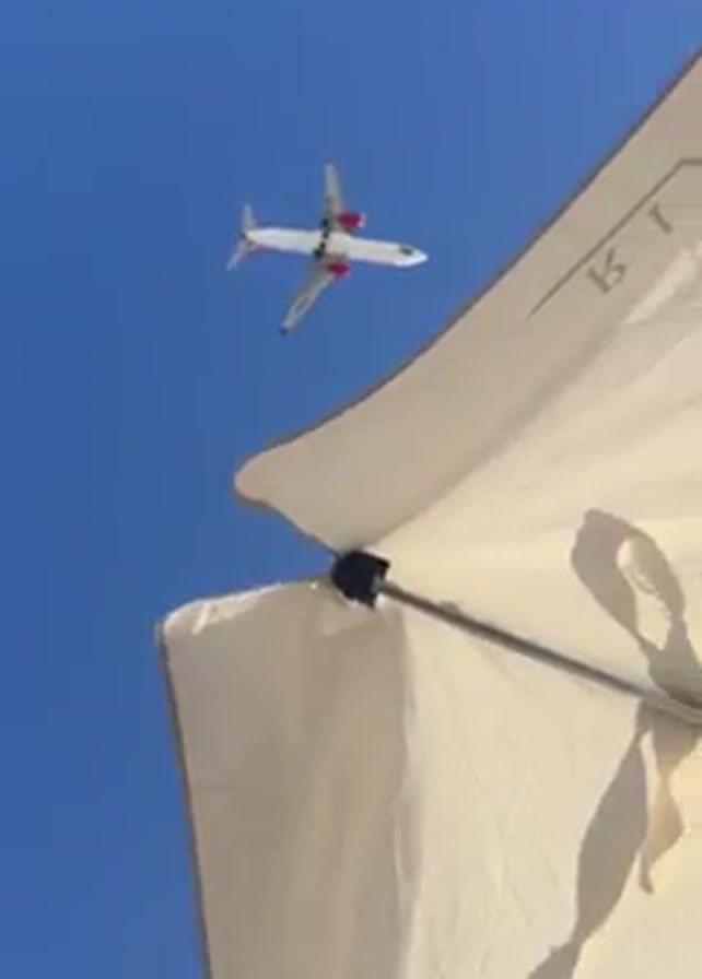 The video starts with a low-angle shot of a clear blue sky. An airplane with a white fuselage and red accents on the wings is flying overhead. The camera angle then shifts to a view of a white beach umbrella with "SOXIV" printed backward on its edge. The camera moves to show the inside of the umbrella, revealing its metal support structure.