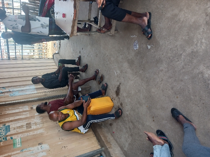 The image displays an outdoor scene in Okene, Nigeria, featuring seven adult males gathered on a concrete ground surface. A corrugated metal wall, light brown and marked with faded white and blue patches including partial text "AGAIN," forms the background on the left. A raised concrete step runs along its base. Three men are seated on wooden benches or blocks against this wall. From left to right: one man wears a yellow, green, and white sleeveless top with dark striped pants, holding a yellow plastic jerry can between his legs, and is looking towards the viewer. The next man wears a maroon shirt and dark shorts. The third wears a black long-sleeved shirt and black trousers, holding a small green object in his left hand. All three are wearing black slip-on sandals. In the mid-ground to the right, a rough, light-colored wooden table stands. A red circular object and a small white item are on its surface. Behind the table, a red motorcycle is partially visible. Two men are standing near the table; one, wearing a white shirt with a dark leaf pattern and patterned trousers, holds a small light-colored object in his hands. Another man, mostly obscured, stands behind him in dark clothing. In the immediate foreground, the lower bodies of two additional individuals are visible: one with light-colored jeans and black slip-on sandals on the far left, and another with grey sweatpants and black slip-on sandals in the lower center. Scattered pieces of white debris are visible on the concrete ground.