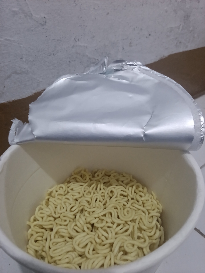 - "The image displays a white, cylindrical instant noodle cup viewed from above, containing dry, pale yellow, curly instant noodles" by FM-BCfv12, licensed under CC BY 4.0