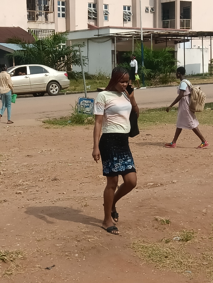 The image captures a daytime scene in Owerri, Nigeria, featuring multiple individuals and urban infrastructure. In the foreground, a young adult female with braided hair walks right-to-left across a reddish-brown dirt path. She wears a light-colored, possibly tie-dye, short-sleeved crop top, a dark knee-length skirt with a blue floral pattern at the hem, and dark slip-on sandals. She holds a dark smartphone to her left ear, engaged in a call, and carries a dark shoulder bag on her left side. Her shadow is visible on the ground to her left. To the left of the primary subject, on a paved road, a silver four-door sedan is present. An individual in a light-colored shirt and blue jeans walks away from the camera near the car. To the right, another young female, dressed in a light pink sleeveless dress over a white t-shirt and multicolored sneakers, walks away from the camera, carrying a tan backpack. Further in the background, near a building entrance, another person in a white top and dark bottom is partially visible. A blue rectangular sign on a pole, partially obscured, stands between the dirt path and the road, displaying white text, likely "PARKING LANE." The background is dominated by a large, light-colored multi-story building featuring multiple windows, some open, and balconies with metal railings. Green trees and dense bushes are situated behind the road and around the buildings. The scene is illuminated by bright natural light, casting distinct shadows.