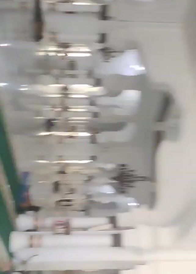 interior of a large building, possibly a mosque, with white marble floors, a green carpet, and elaborate white ceilings with multiple chandeliers. There are people present in the background, some standing and some seated on the floor.