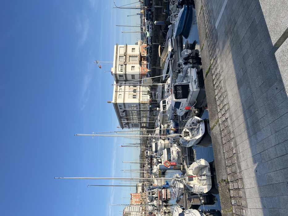 The image depicts a marina in A Coruña, Spain, specifically facing the Real Club Náutico de La Coruña building. The scene is captured on a clear, sunny day under a bright blue sky. In the foreground, a paved stone walkway and a rough-hewn stone border line the water's edge, exhibiting shadows consistent with morning or late afternoon sunlight. The midground is dominated by numerous boats moored in the marina. These include various white sailboats with visible masts and rigging, and several white motorboats. A red lifebuoy is attached to one of the docks. A Spanish flag and another flag (possibly Galician or a club flag) are visible on some of the boats. Prominently featured in the midground, beyond the boats, is the Real Club Náutico de La Coruña, a multi-story white building with a distinctive architectural style, featuring balconies, multiple windows, and a central entrance. Flags, including a Spanish flag and what appears to be the club's burgee, are flying from its rooftop. Behind the club building, several cars are parked along a street. To the left of the club building, other residential or commercial buildings of the city, characterized by lighter facades and some red roofs, are visible in the distance. The background consists of the city's urban landscape extending towards the horizon, beneath the clear blue sky with minimal cloud cover. No individuals are distinctly visible in the scene.