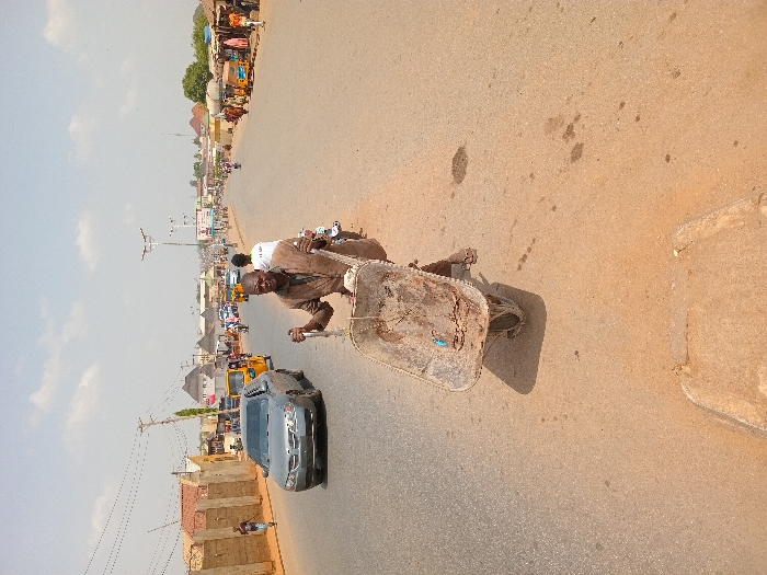 A man is pushing a wheelbarrow down a paved road in Badiko, Nigeria, located at latitude: 10