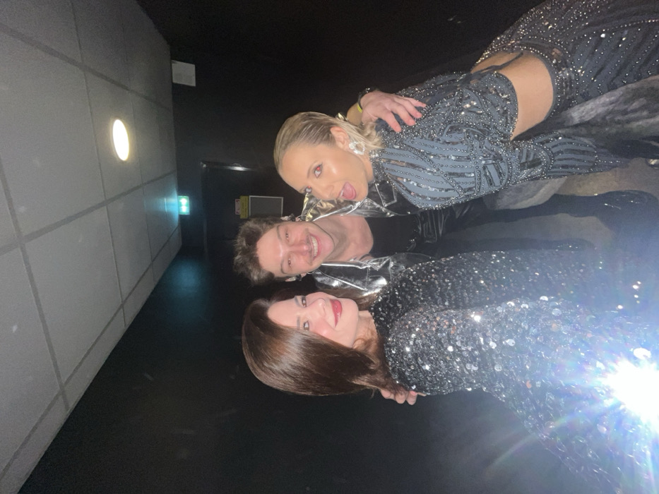 The image depicts three individuals in a group portrait taken within a dimly lit, dark-walled interior space, consistent with a backstage hallway, in Dunkirk, France. On the left, a woman with shoulder-length dark brown hair and red lipstick wears a long-sleeved black sequined garment. She smiles towards the camera, which is likely held by her given the bright lens flare emanating from the lower-left foreground. In the center stands a man with light brown curly hair and a mustache. He wears a shiny silver metallic jacket over a dark undershirt and dark pants. He smiles broadly at the camera, with small in-ear monitors visible in both ears. His right arm is positioned behind the woman to his right. The woman on the right has slicked-back blonde hair and wears a dark, heavily beaded and sequined long-sleeved crop top with a matching skirt. She is shown with an open mouth, tongue slightly extended, and wide eyes, her right eye exhibiting a red-eye effect from the flash. Her left arm is around the waist of the central man. The background consists of dark, featureless walls and a paneled ceiling with recessed lighting fixtures. A green illuminated emergency exit sign is visible in the upper right quadrant of the image, with another rectangular wall-mounted object below it.