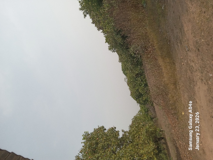 The image depicts an outdoor landscape in Konike, Nigeria, under a light grey, hazy sky. The foreground consists of a dirt path or ground covered with sparse, dry, brown-yellow vegetation. The terrain gently slopes upward from the left to the right, forming a low ridge or hill across the mid-ground. On the left side of the frame, several trees with green foliage are visible. Along the crest of the slope in the mid-ground and right side, a dense line of trees with darker green foliage forms a thick natural barrier. Scattered patches of dried, reddish-brown brush are present on the slopes between the foreground and the denser tree line. No people, animals, or artificial structures are clearly visible, apart from a small, dark, irregular shape in the top-left corner, possibly the edge of a building or overhang. A digital watermark in the lower-left corner indicates "Samsung Galaxy A04e" and the date "January 23, 2026."
