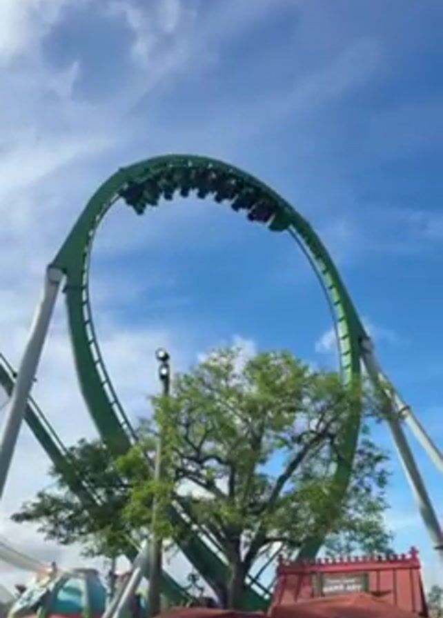 green roller coaster loop in front of a blue sky with scattered clouds. The roller coaster has cars filled with people. The loop is situated above some trees and a red-roofed structure. In the distance, behind the loop, there are white triangular structures. The camera pans slightly during the video.