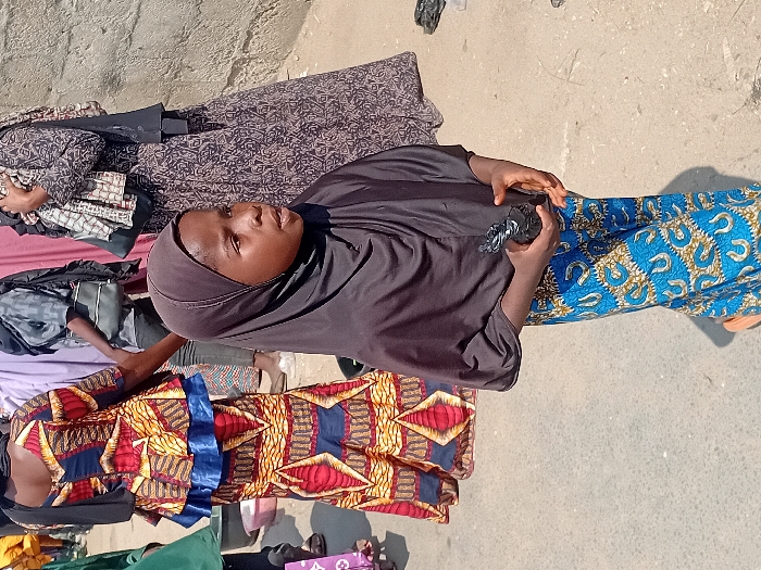 Several women are lying on a concrete surface, facing different directions. One woman is wearing a dark hijab and a blue and yellow patterned dress and is holding a black object. Another woman is wearing a dark patterned outfit. The woman closest to the viewer is wearing a colorful patterned dress with a blue ribbon. Various bags and personal belongings are scattered around them. The scene is illuminated by bright sunlight.