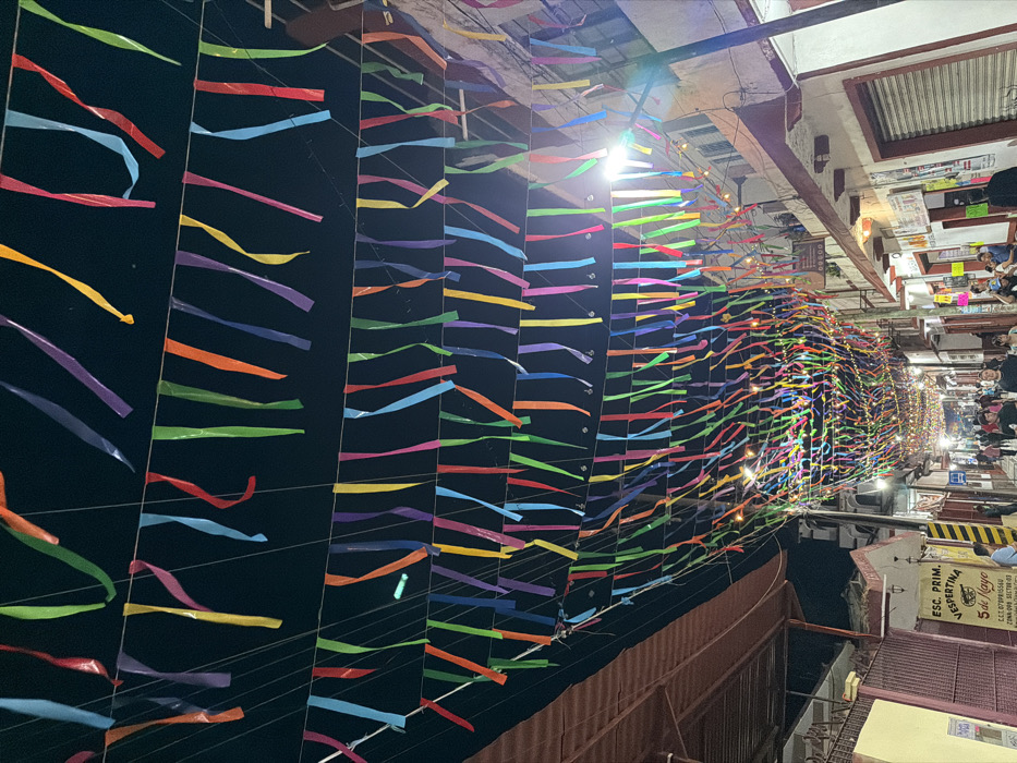 An upward view of a street market at night, adorned with colorful streamers hanging in rows. The streamers span the width of the street, creating a vibrant canopy. Beneath the streamers, market stalls and shops are visible, with people milling around. The scene is illuminated by overhead lights and string lights, casting a warm glow. Buildings line both sides of the street, adding to the enclosed feeling of the market.